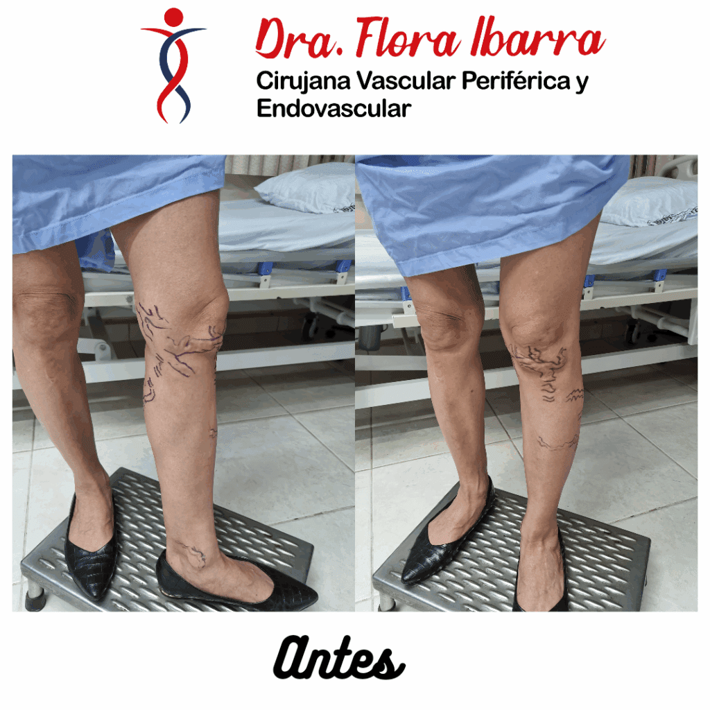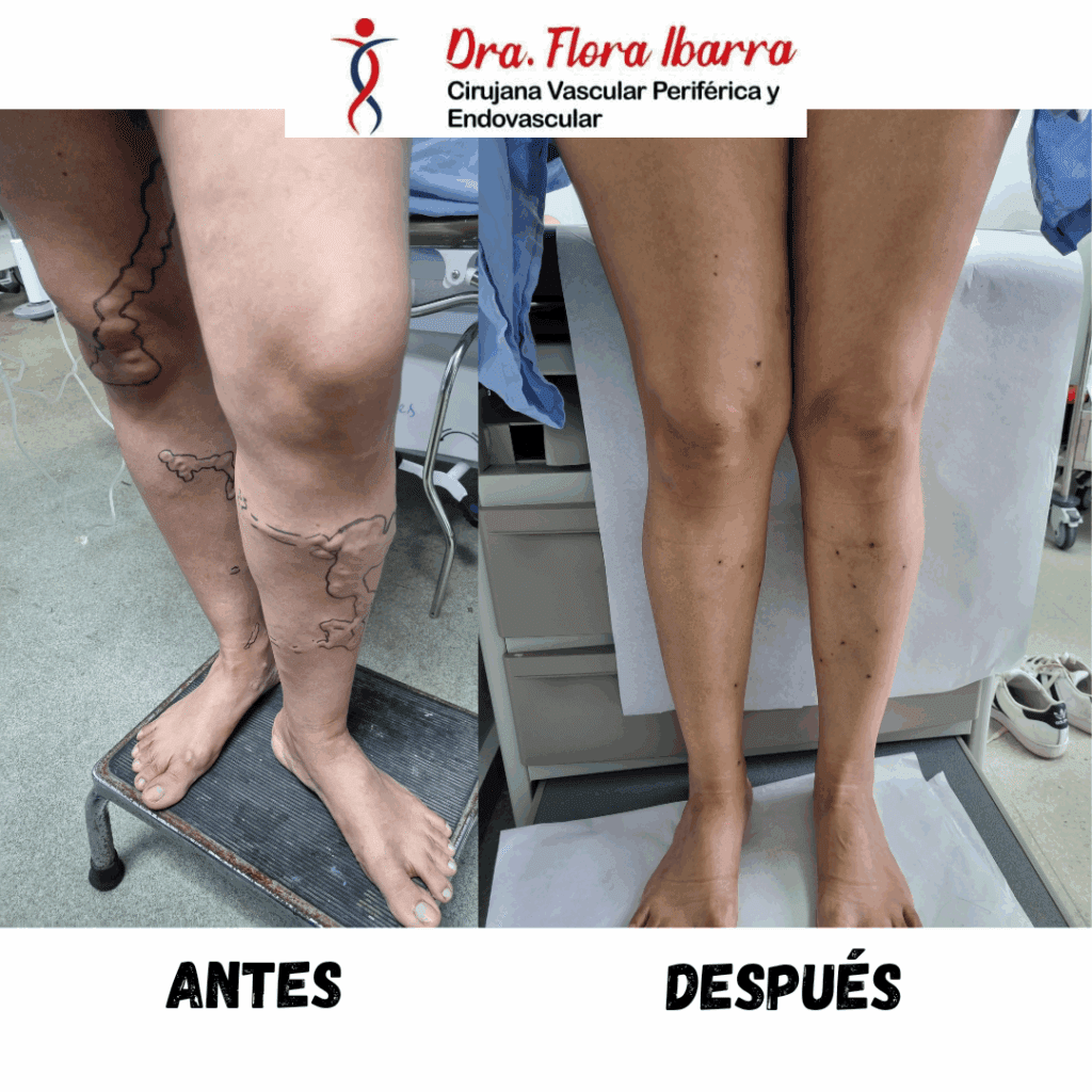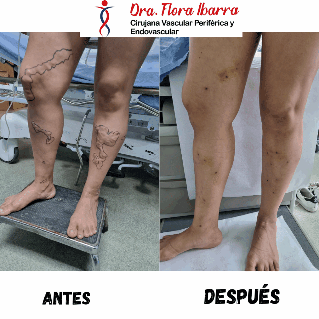 Várices de gran calibre de afección extensa bilateral de miembros inferiores pre y post tratamiento.